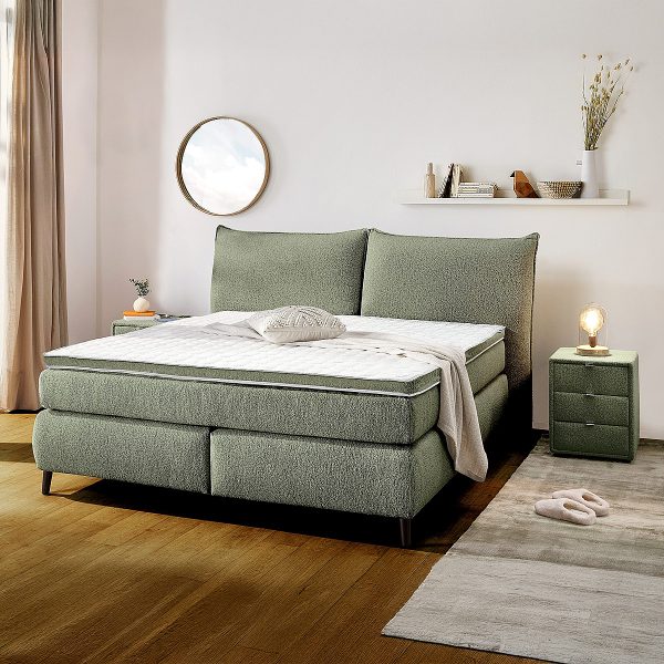 Der Liegekomfort punktet durch eine Box mit Bonell-Federkernpolsterung, die als Unterfederung dient sowie hochwertige 7-Zonen-Tonnentaschen-Federkernmatratzen im Tandembezug, welcher ein gegenseitiges Verschieben der einzelnen Matratzen verhindert.